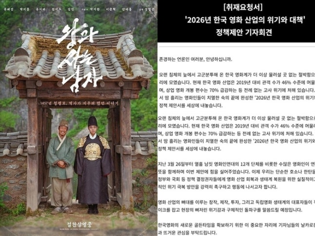 영화인연대는 오는 9일 ‘2026 한국 영화 산업의 위기와 대책’ 정책제안 기자회견을 열고 정부와 국회에 실질적인 위기 극복 방안을 촉구할 예정이다. 이들은 오늘(7일) 언론에 보낸 긴급 요청서에서 “단순한 호소나 한탄을 넘어 생태계 복원을 위한 행동에 나서겠다”고 밝혔다.