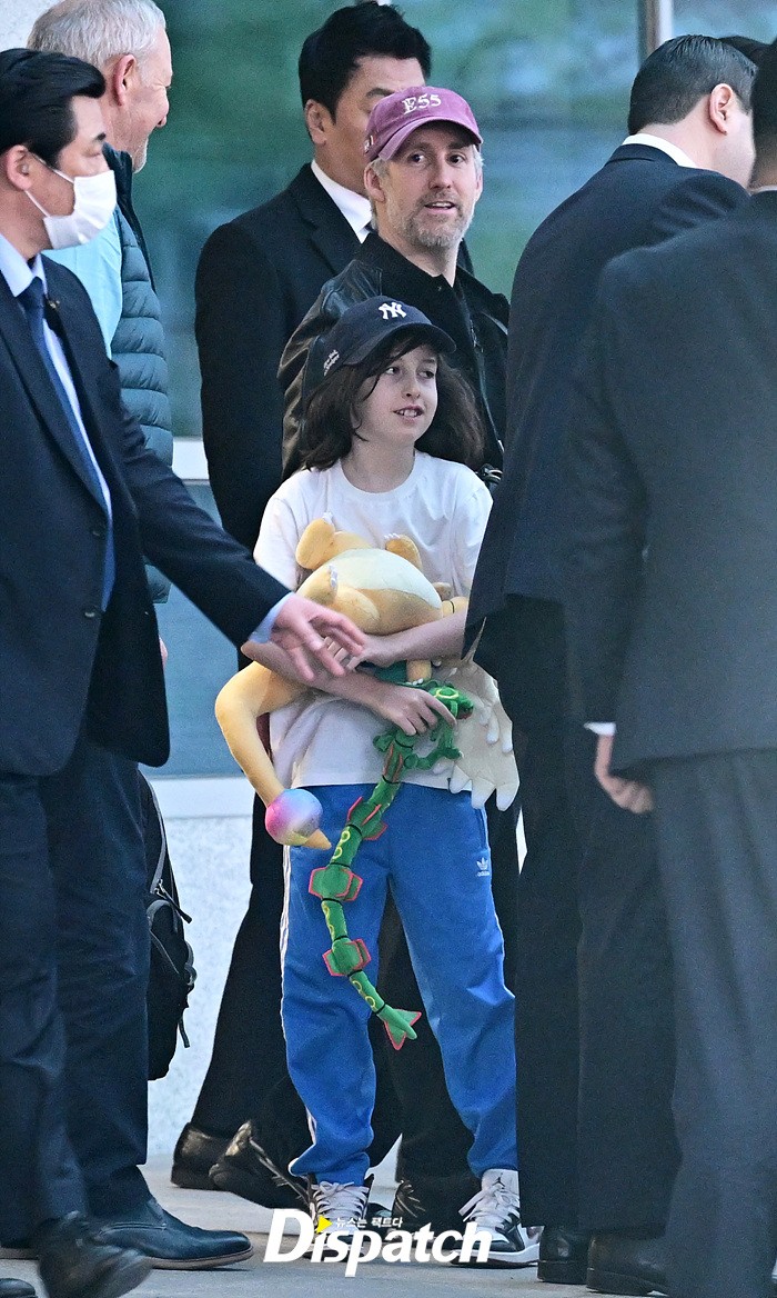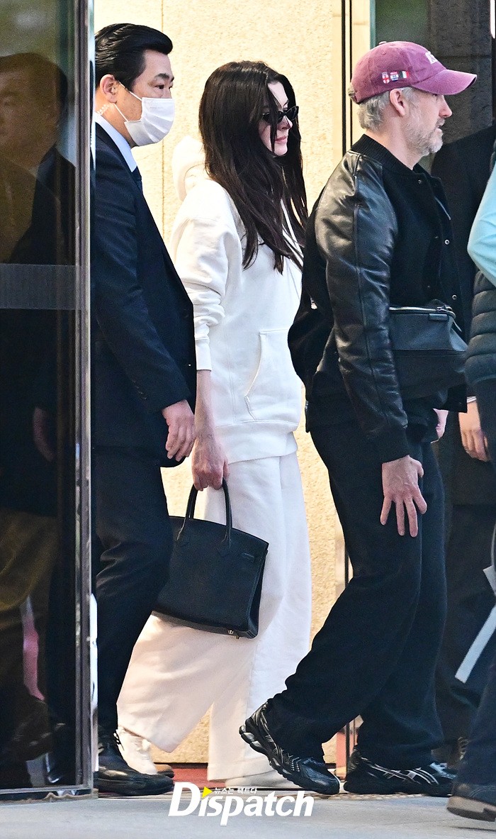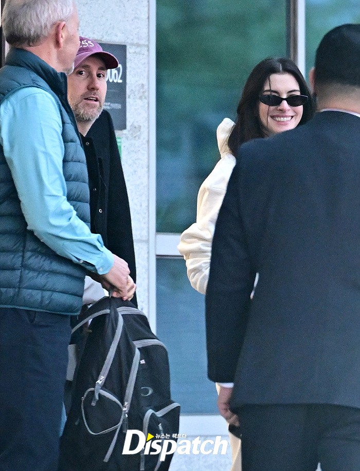앤 해서웨이는 남편 애덤 셜먼, 그리고 두자녀와 함께 입국장에 모습을 드러냈다. 밝은 미소로 등장한 앤은 팬들에게 환한 손인사로 화답했다.