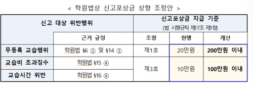 또한 학원법 시행규칙을 개정, 초과교습비 징수 등 사교육 불법행위 신고포상금을 10만∼20만원에서 100만∼200만원으로 10배 인상할 계획입니다.