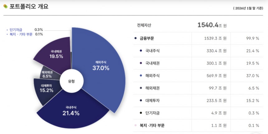 금융부문 포트폴리오 비중을 살펴보면 △국내 주식 21.4%(330조4000억원) △국내 채권 19.5%(300조1000억원) △해외주식 37%(569조9000억원) △해외채권 6.5%(99조7000억원) △대체투자 15.2%(233조5000억원) △단기자금 0.3%(4조9000억원)다.