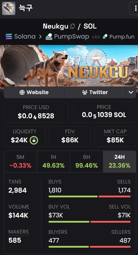 8일 대전 오월드 동물원에서 2살 수컷 늑대 '늑구'가 탈출한 이후 탈중앙화거래소(DEX) 펌프스왑(PumpSwap)에서 늑구의 이름을 딴 밈 코인 'Neukgu'가 등장해 유통되고 있는 것으로 확인됐다.