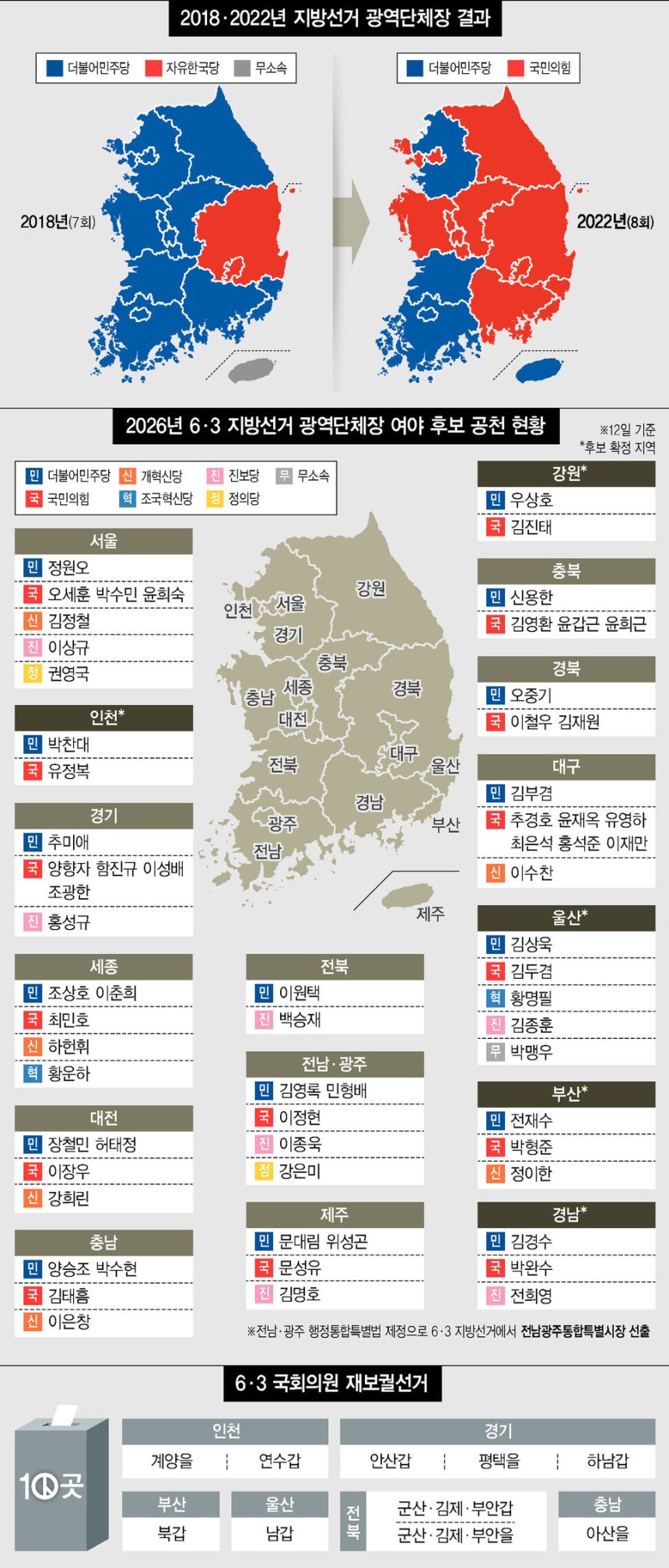 6·3 지방선거와 함께 치러지는 국회의원 재보궐선거 지역이 12일 현재 사실상 10곳으로 늘어난 가운데 조국 조국혁신당 대표와 하정우 청와대 에이아이(AI)미래기획수석, 한동훈 전 국민의힘 대표의 출마 여부와 지역에 관심이 커지고 있다.