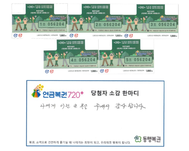 지난 10일 복권수탁관리업자 동행복권에 따르면 제310회차 ‘연금복권720+’ 추첨 결과 서울 노원구의 한 판매점에서 복권을 구매한 A씨가 1등(1매)과 2등(4매)에 모두 당첨됐다.