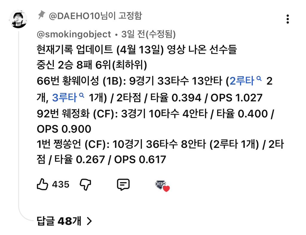 현재 팀은 최하위이지만 선수들 성적ㄷㄷ