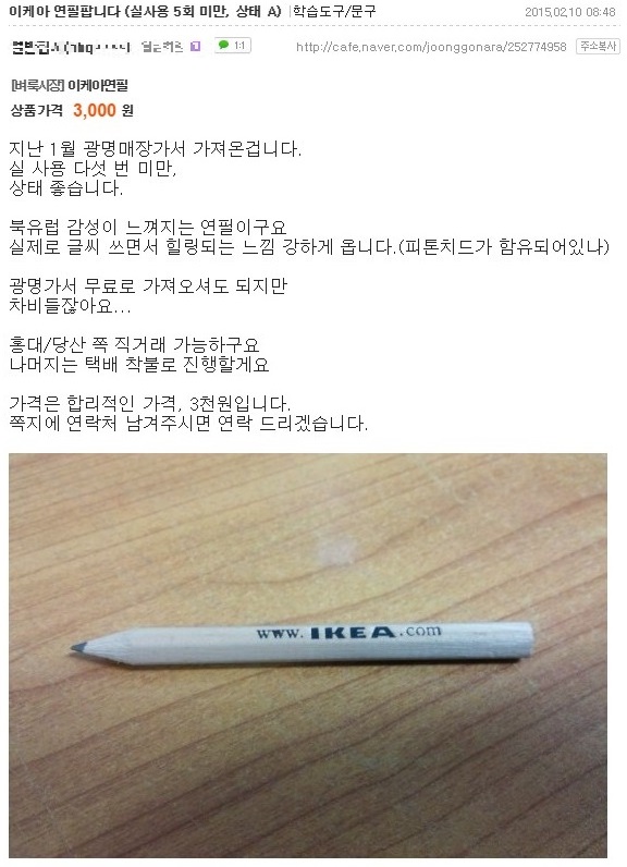 그럼에도 식지 않던 '연필거지' 이슈의 화룡점정은 네이버 중고거래 카페에 등장한 '이케아 연필 팝니다'라는 게시물이었습니다. 정말 많은 분들이 "걱정하던 일이 실제로 일어났다", "'이케아 연필거지'라는 말이 사실이었네" 등의 의견을 내놓으셨고, 판매글은 10일 하루동안 인터넷 세계를 뒤덮었습니다.