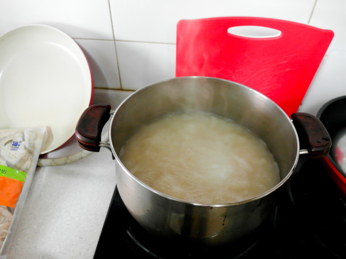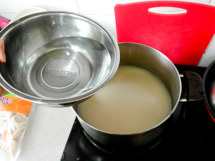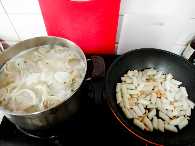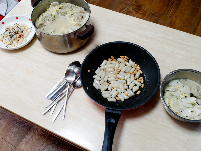 그다음 물에 불려둔 떡국떡을 투하합시다.