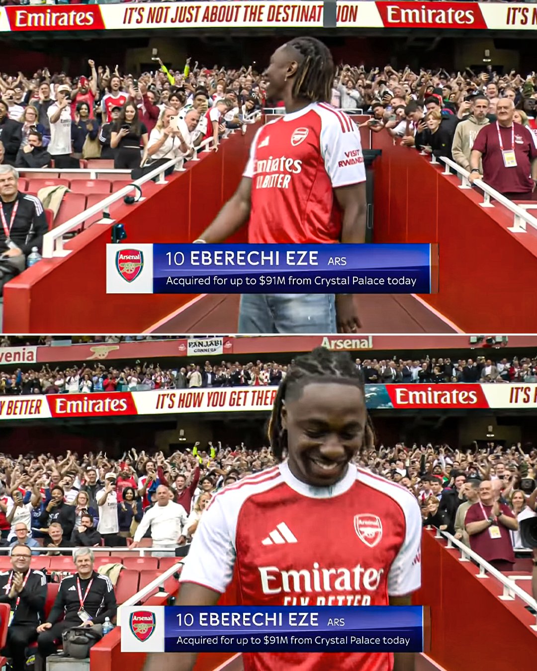 아르테타 감독은 에제에게 그날 오후 아스날 이사회가 열릴 예정이라고 말했습니다. 회의가 끝난 뒤, 들뜬 마음의 에제는 거래가 사실상 성사되었다는 소식을 전해 들었습니다. 수요일 밤이 되자, 아스날은 크리스탈 팰리스와 선수 이적료 £60m에 합의했고, 추가 조건에 따라 £7.5m가 더해질 수 있는 계약을 체결했습니다. 또한 에제 측은 4년 계약(추가 1년 연장 옵션 포함)에 대해서도 개인 합의를 마쳤습니다.